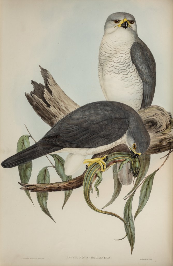 Ornithological study of the New Holland goshawk Astur novæ-hollandiæ, showing a male and female bird of the natural size, perched together on a branch with the male holding down a lizard with his beak and talons.