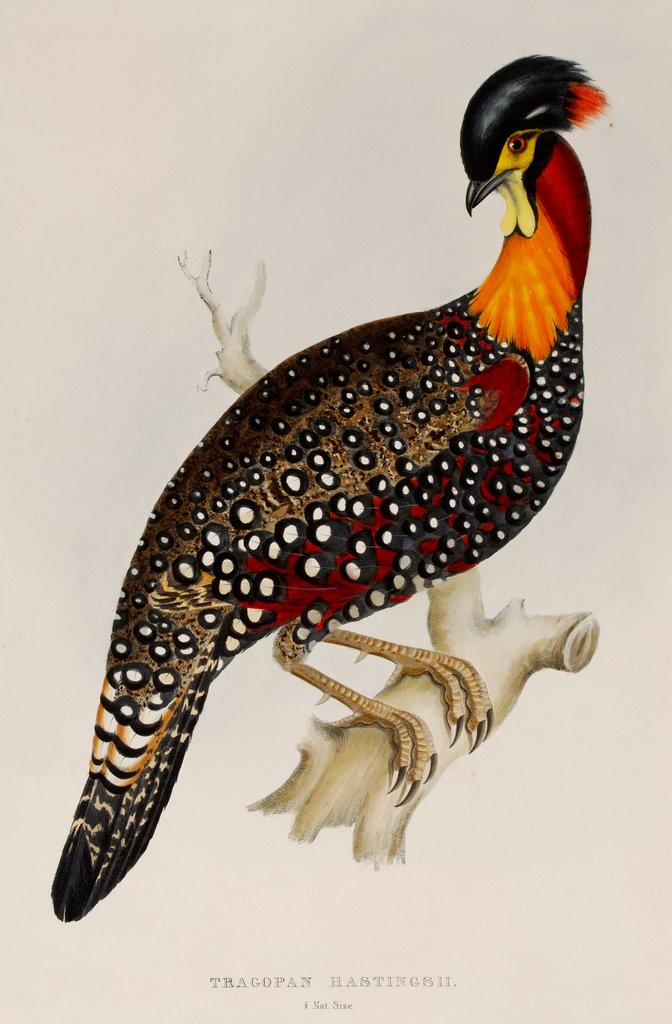 Inscribed ‘TRAGOPAN HASTINGSII. 2/3 Nat. Size. Drawn from Nature and on Stone by E. Gould. Printed by C. Hullmandel.’