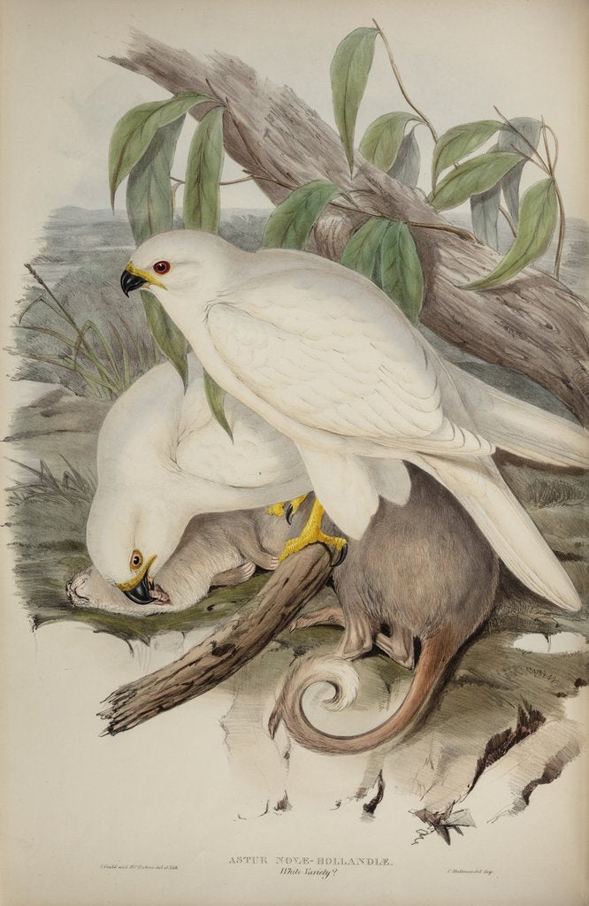 Ornithological study of the white goshawk, Astur novæ-hollandiæ Albino, showing a male and female bird of the natural size. The small male is perched on a branch and the larger female is shown in a landscape consuming a large rodent.
